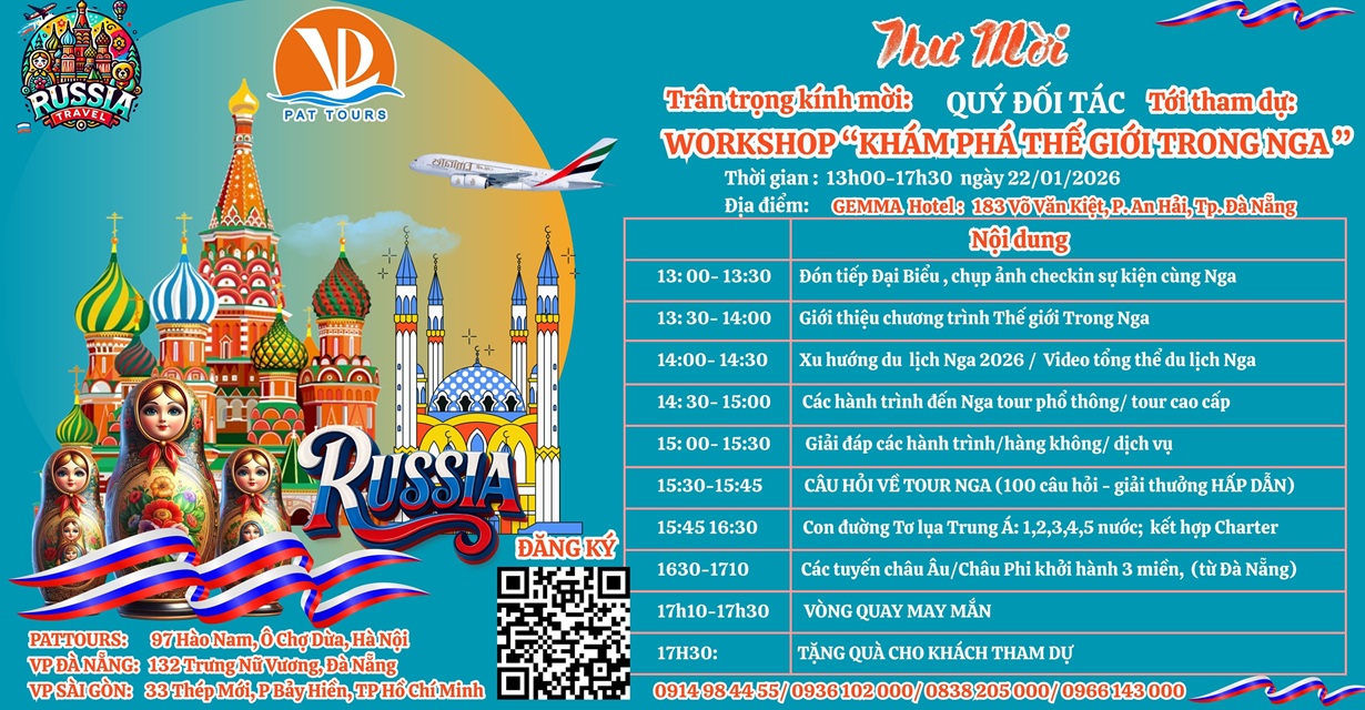 Nội dung chính: Cập nhật xu hướng du lịch Nga 2026; Giới thiệu các tuyến hành trình quốc tế khởi hành từ Miền Trung và đặc biệt là hành trình Di sản Trung Á.