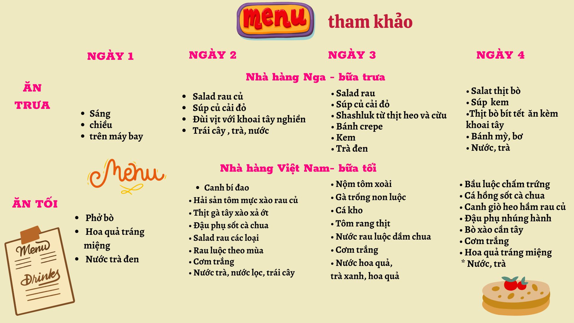 - Thực đơn ăn trong đoàn đã được cân đối kết hợp giữa thực đơn kiểu Nga và thực đơn Á để Quý khách dễ ăn và đảm bảo đủ dinh dưỡng.
